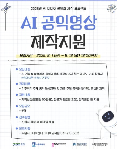모집대상은 경기도 거주(소재) 창작자로, 수원시 거주자를 우대한다. 서류심사를 거쳐 총 6명을 선정할 예정이며, 선정된 참여자들에게는 공익영상 2편에 대한 제작보상금(편당 50만원)과 전문가 멘토링, 창작공간(AI 미디어랩실) 등을 지원한다.
