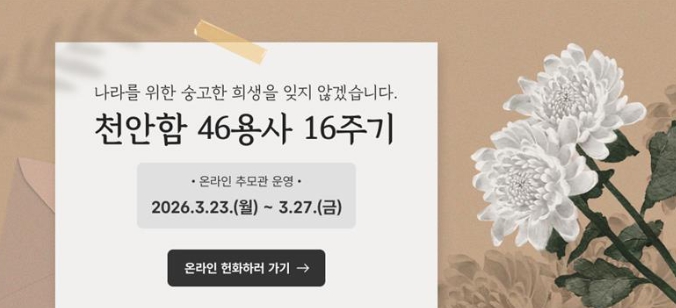 이어 오는 27일에는 태조산공원 내 천안보훈공원에서 천안함 46용사 16주기 추모식을 엄숙히 거행할 예정이다. 이날 행사에는 천안함 유족, 보훈단체장, 전사자 모교 학생 등 100여 명이 참석해 용사들의 희생을 기리고 그 뜻을 기념하는 시간을 갖는다.