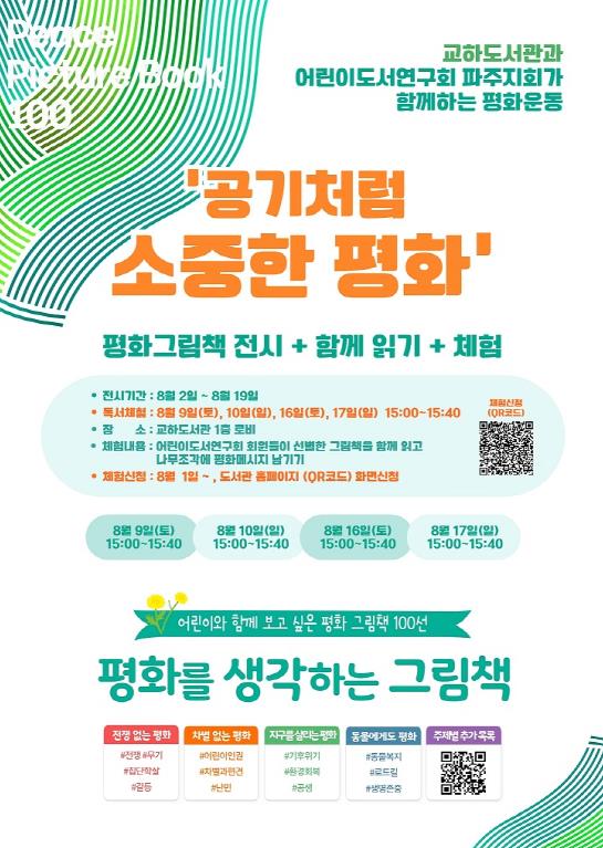 또한 8월 17일까지 매주 토·일요일마다 오후 3시부터 약 40분간 교하도서관 1층 로비에서는 그림책 낭독 행사와 함께 평화쪽지 쓰기 체험 활동도 진행한다. 참여를 원하는 어린이는 파주시도서관 누리집에서 신청할 수 있다.