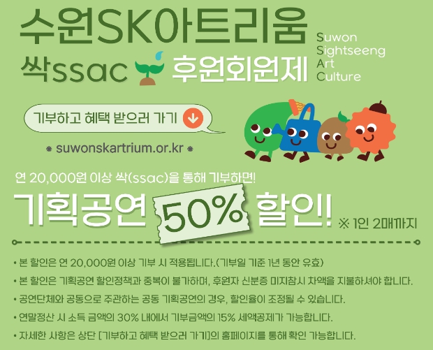 수원문화재단 관계자는 “이번 싹(ssac) 후원회원제는 문화예술 기부자에게 공연 관람 혜택을 제공하는 것이자, 관객과 함께 문화예술 선순환 생태계를 만들어가는 방법 중 하나이다”라며, “문화예술 기부 문화 조성을 통해 지속가능한 문화예술, 관광 재원을 확보하여 수원SK아트리움 관객들의 문화예술 접근성을 높일 수 있도록 노력하겠다”고 말했다.