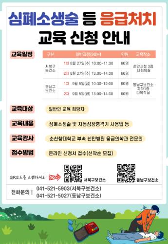 교육은 오는 8월 27일 천안시청 3층 대회의실과 9월 5일 동남구보건소 지하 1층 다목적실에서 오전 10시와 오후 1시에 진행되며, 회당 60명씩 총 240명이 참여할 수 있다.