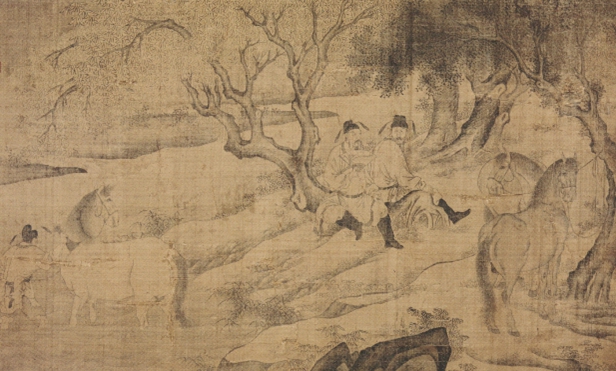 강가에서 쉬고 있는 관리들, 나무에 매어진 말들, 강에서 마부가 말을 씻는 장면 등 세 그룹으로 따로 떨어진 요소가 한 화면에서 자연스럽게 통합돼 있다.