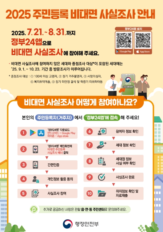 비대면 조사는 오는 8월 31일까지 진행되며, 세대원 중 1명이 주민등록지에서 정부24앱에 접속해 해당 세대에 대한 거주 정보를 확인‧응답하면 된다.