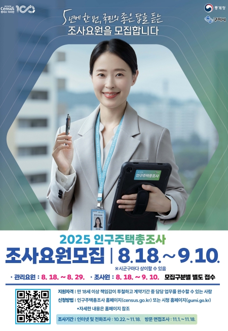 구미시 관계자는 “2025 인구주택총조사의 슬로건은 ‘당신의 답이 대한민국에 좋은 답이 됩니다’라며, 성실하고 책임감 있는 시민들의 많은 지원을 바란다”고 했다.