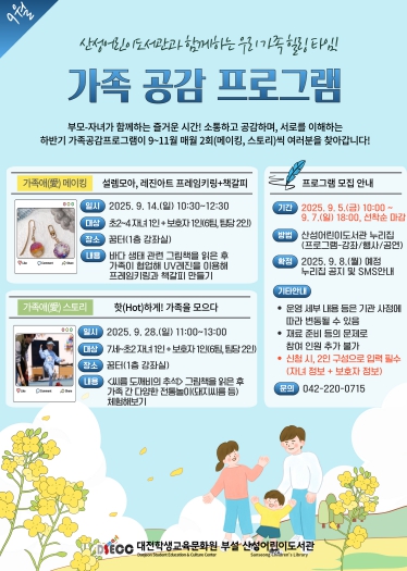 대전학생교육문화원 엄기표 원장은 “이번 가족 공감 프로그램이 바쁜 일상 속, 가족이 함께 마음을 나누는 소중한 시간이 될 것”이라며 “다양한 가족 단위 프로그램을 기획하여 도서관이 부모와 자녀가 함께 소통하는 문화공간이 되도록 최선을 다하겠다”고 말했다.