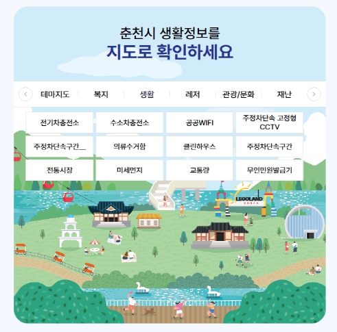 생활안내지도는 지난 2022년부터복지, 생활, 레저, 관광·문화, 재난 등 총 5개 분야 23개 주제의 생활밀착형 정보를 지도 기반으로 제공하는 서비스다. 인터넷에서 ‘춘천시 생활안내지도’를 검색하거나 시청 홈페이지 퀵메뉴를 통해 누구나 접속할 수 있다.