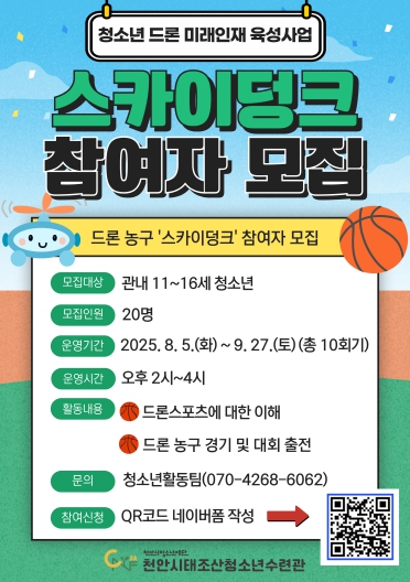 스카이덩크는 청소년 드론 미래인재 육성사업의 일환으로 드론 농구 교육, 실전 경기 체험, 드론 대회 참여 등을 통해 청소년들이 4차 산업 기술을 직접 체험하고, 미래 산업에 대한 진로를 탐색할 수 있도록 기획된 프로그램이다.