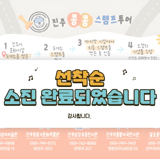 ‘진주 콩콩 투어’는 진주시 문화시설사업소 소속 5개 문화시설인 ▲진주시립이성자미술관 ▲진주익룡발자국전시관 ▲진주청동기문화박물관 ▲진주남강유등전시관 ▲일호광장 진주역을 자유롭게 탐방하며 스탬프를 찍는 형식으로 진행됐다. 지난 7월 18일부터 시작된 이번 투어는 12세 이하 어린이와 아이를 동반한 가족들이 함께 참여해 진주의 문화와 예술, 역사 콘텐츠를 오감으로 체험할 수 있는 여름방학 맞춤형 문화활동으로 평가받았다.