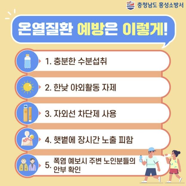 홍성소방서는 ▲물 자주 마시기 ▲외출 시 모자·양산 착용 ▲한낮(12~17시) 야외 활동 자제 ▲실내 적정 온도 유지 등의 폭염 대응 수칙을 강조했다. 또한 에어컨, 선풍기 등 냉방기기 사용 증가로 인한 전기 화재 예방을 위해 문어발식 콘센트 사용 자제와 사용 후 전원 차단도 당부했다.