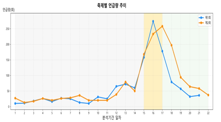 SNS 분석 결과, 제2회 축제의 일평균 언급량은 약 70건으로, 전년도 대비 약 20% 증가한 것으로 나타났다. 축제에 관한 내용은 주로 블로그(58.3%)에 활발하게 게시됐으며, 워터슬라이드, 건강 부스 등 신규 프로그램에 대한 관심이 확인됐다. 긍정 및 부정 반응을 확인할 수 있는 감성 분석에서는 긍정 반응이 부정 반응보다 약 12배 높았으며, 축제 전반에 대한 시민들의 긍정적 인식을 확인할 수 있었다.
