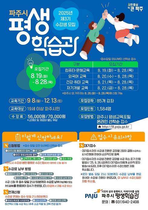 최희진 평생교육과장은 “파주시 평생학습관은 실생활에 도움이 되는 유익한 강좌들을 다양하게 준비했으며, 2025년 제3기 모집부터는 수강료 면제신청 시스템을 개편하여 시민들의 불편을 최소화하고자 노력했다”라며 “앞으로도 시민들의 의견을 적극 반영하여 더욱 만족도 높은 교육 서비스를 제공할 수 있도록 최선을 다하겠다”라고 말했다.