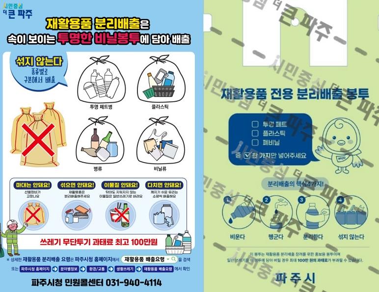 심재우 자원순환과장은 “이번 전용 봉투 배부는 단순히 쓰레기를 버린다는 개념을 넘어, 시민 여러분께서 자원순환에 직접 참여한다는 인식을 확산하기 위해 마련된 것”이라며 “재활용품은 재활용품끼리 배출하는 올바른 분리배출 문화를 정착시키는 데 목적이 있다”라고 말했다.