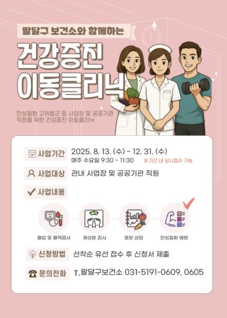 팔달구보건소 관계자는 “건강증진 이동클리닉이 직장인의 건강관리 부담을 덜어주고, 고위험군을 조기에 발굴하는 데 실질적으로 도움이 되길 바란다”며 “지속적인 홍보와 교육으로 지역 건강 수준 높이는 데 앞장서겠다”고 밝혔다.