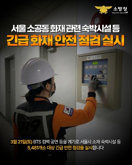 3월 21일(토) BTS 컴백 공연 등을 계기로 서울시 소재 숙박시설 등 5481개소 대상 긴급 안전점검을 실시합니다.