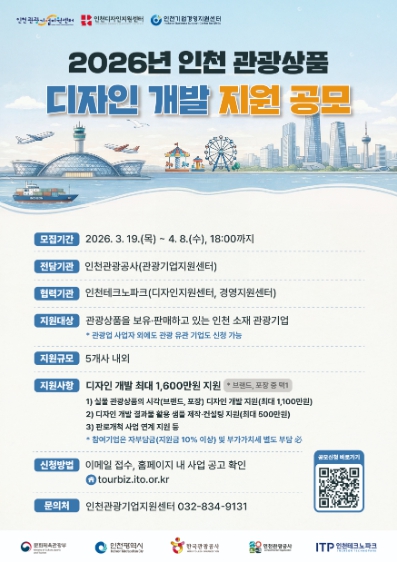 신청 접수는 4월 8일 오후 6시까지 진행되며, 자세한 내용은 인천관광기업지원센터 홈페이지 공지사항에서 확인할 수 있다.