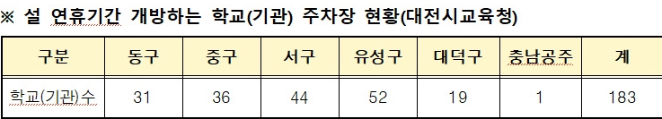 재정과 윤석오 과장은 “명절 연휴 동안 학교와 기관의 주차장 개방을 통해 지역 주민과 귀성객들의 주차 불편이 해소되길 바란다”라며, “학교가 지역사회와 함께 이용하는 공공시설인 만큼 안전하고 청결한 주차 문화 조성에 이용객들의 적극적인 협조를 부탁드린다”라고 밝혔다.