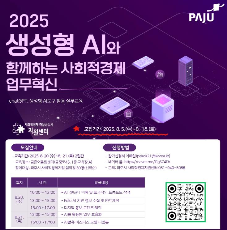 이번 교육은 파주시 관내 사회적기업, 협동조합, 마을기업 등 사회적경제기업의 임직원을 대상으로 하며, 참가비는 무료다. 교육은 금촌어울림센터 교육장에이(A)에서 진행되며, 모집 기간은 8월 5일부터 8월 16일까지 선착순 30명을 모집한다.