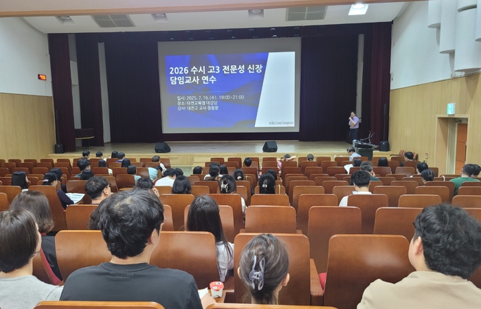 7월 16일에는 관내 고등학교 3학년 부장 및 담임교사 150여 명이 참석한 가운데, ‘2026학년도 대입 수시모집 진학상담 전문성 신장 연수’를 실시했다. 연수에서는 대전고 정광문 교사(대전대입지원단, 대교협 대입상담교사단)가 강사로 나서, 2026학년도 수시모집 대학별 전형 분석과 지원전략을 중심으로 현장 사례 중심의 실질적인 정보를 제공했다. 이를 통해 교사들이 수험생 지도에 활용할 수 있는 전형별 맞춤형 상담 역량을 높이는 계기가 됐다.