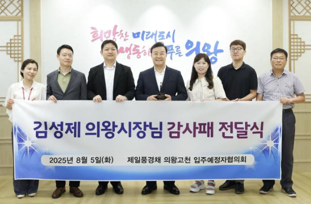이번 감사패 수여는 그동안 고천제일풍경채 입주예정자들이 겪어온 크고 작은 문제와 어려움에 대해 의왕시가 적극적으로 귀 기울이고 신속히 조치한 데에 따라 이뤄졌다.