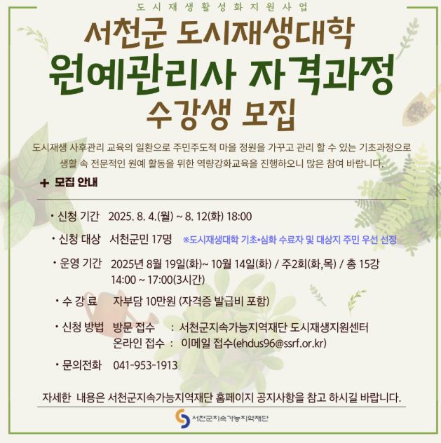 수강신청은 8월 4일부터 8월 12일까지 서천군지속가능지역재단 도시재생지원센터 방문 또는 이메일을 통해 가능하다