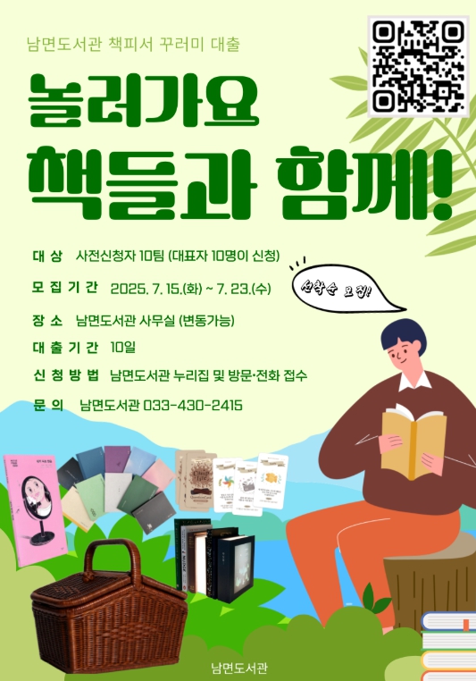 체험 강좌 프로그램 및 ‘책피서 꾸러미’ 대출 이벤트는 남면도서관 누리집을 통해 7월 15일부터 7월 23일까지 참가자 선착순 사전접수를 받는다.