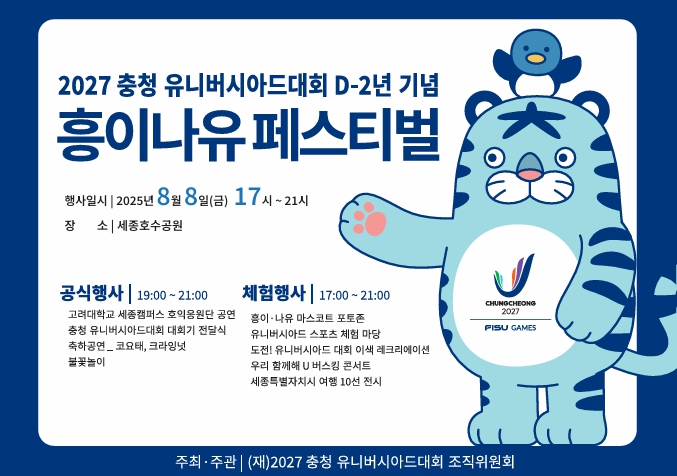 강창희 조직위원장은 “흥이나유 페스티벌에 많은 충청 시민들이 함께해 충청의 멋과 흥을 만끽하고, 2027 충청 유니버시아드대회 성공 개최를 위해 화합하는 시간이 되길 바란다” 고 전했다.
