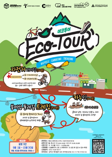 에코투어는 2024년부터 재단법인 춘천레저‧태권도조직위원회 레저사업부 운영 중인 레저 프로그램으로, 의암호를 중심으로 자전거, 카누, 붕어섬 트레킹을 코스로 체험할 수 있다. 도심 속에서 자연 그대로의 생태환경을 온몸으로 느낄 수 있으며, 특히 붕어섬 트레킹 구간은 일반인 출입이 제한된 구역으로, 훼손되지 않은 자연을 직접 보고 걷는 특별한 경험을 제공한다.