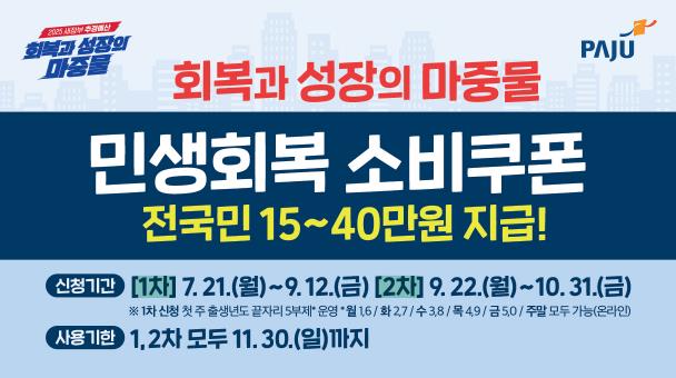 1차 지급 대상은 민생회복 소비쿠폰 지급계획의 발표일 전날인 2025년 6월 18일을 기준으로 거주 중인 모든 전 국민이며, 지원액은 파주시민 기준 1인당 15만 원을 기본으로 하되, 소득별 맞춤형 지원을 위해 차상위계층은 1인당 30만 원, 기초생활수급자는 1인당 40만 원이 지급된다.