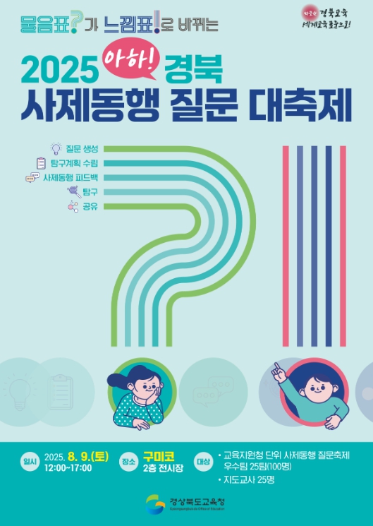 이번 축제는 교육지원청 단위 질문 축제에서 선발된 우수팀 25팀(팀별 학생 4명, 지도교사 1명 구성)이 참여해, 교사와 학생이 함께 소통하며 배움을 확장하는 장이 마련된다.
