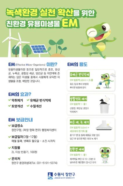 EM 발효액은 장안구청과 동 행정복지센터(파장동, 영화동, 연무동) 등 총 4곳에 설치된 EM 복합기를 통해 매월 둘째·넷째 주 월요일(월 2회)마다 시민들에게 보급될 예정이다.