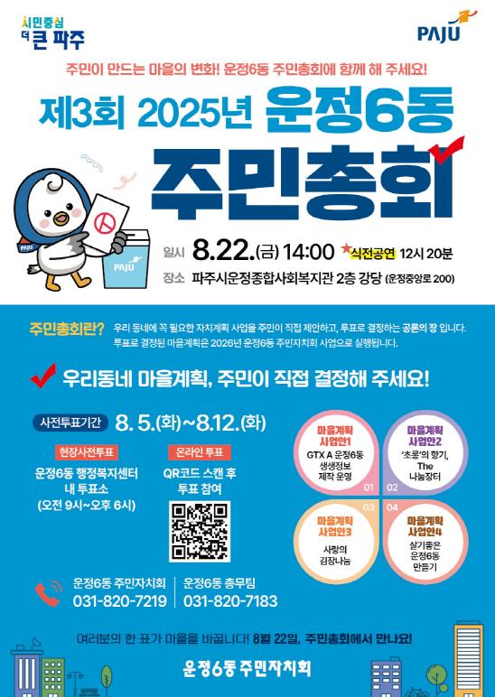 투표는 사전투표와 본투표로 나누어 진행된다. 사전투표는 8월 5일부터 12일까지 운영되며, 운정6동 행정복지센터 내 현장투표소(오전 9시~오후 6시) 또는 정보무늬(QR코드)를 활용한 온라인 투표로 참여할 수 있다. 주민총회에서 의결된 마을계획 사업들은 내년(2026년) 마을사업으로 추진된다.