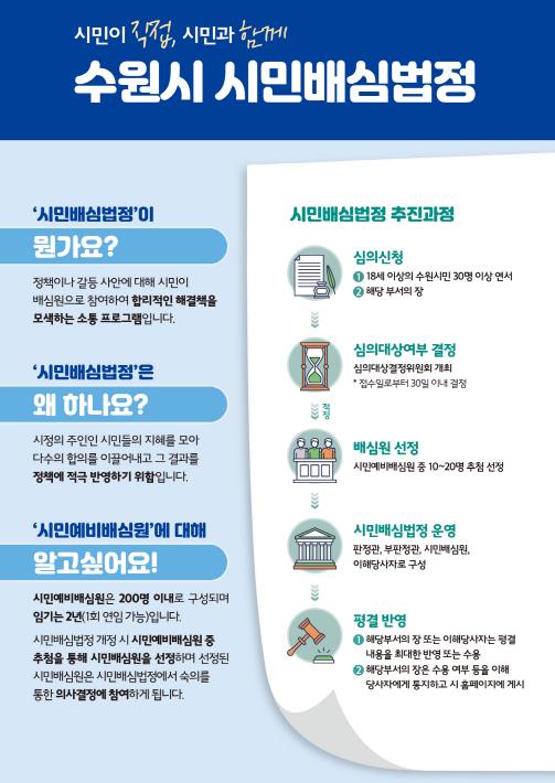 수원시가 2012년 전국 지자체 최초로 개정한 ‘수원시 시민배심법정’은 시정 주요 시책, 갈등이 예상되거나 발생한 현안 등에 대해 시민이 함께 지혜를 모아 성숙한 합의를 끌어내고, 그 결과를 정책에 적극적으로 반영하기 위한 시민 참여형 갈등관리 제도다.