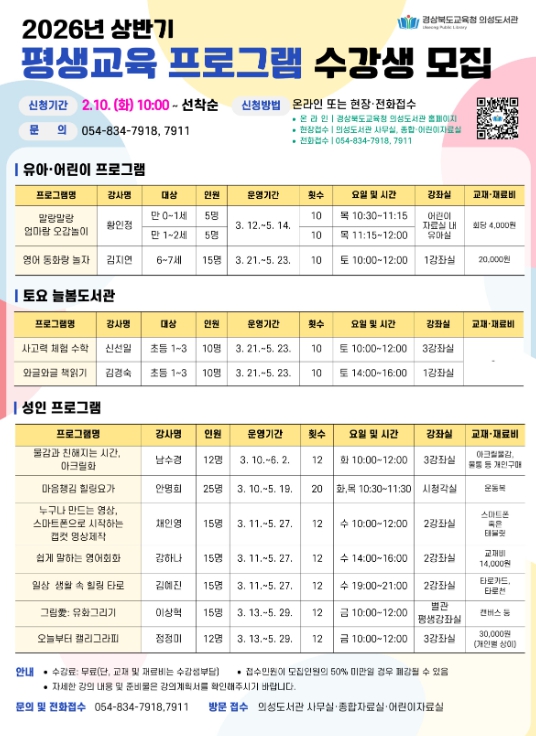 프로그램 신청은 오는 10일 10시부터 누리집, 방문 및 전화 접수를 통해 가능하며, 자세한 내용은 의성도서관 누리집 을 참고하거나 전화로 문의하면 된다.