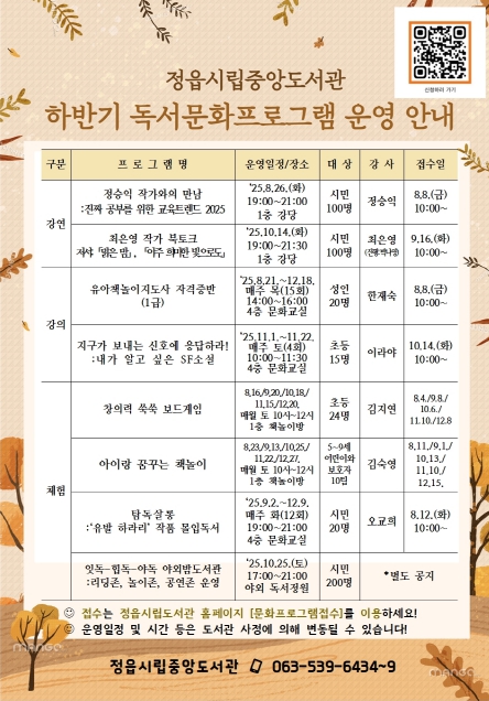 참여 신청은 정읍시립도서관 누리집을 통해 선착순 접수 가능하며, 프로그램별 신청 일정이 달라 사전 확인이 필요하다.