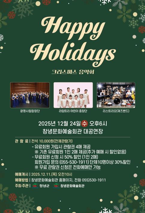 주요 출연진으로는 국내 정상급 하모니를 자랑하는 광명시립합창단을 비롯해 맑고 순수한 음색의 어린이 중창단 ‘라임트리 프렌즈’, 감각적인 연주로 사랑받는 재즈밴드 ‘리스트리오’가 참여해 클래식과 캐럴, 대중적인 명곡을 다채롭게 들려준다.