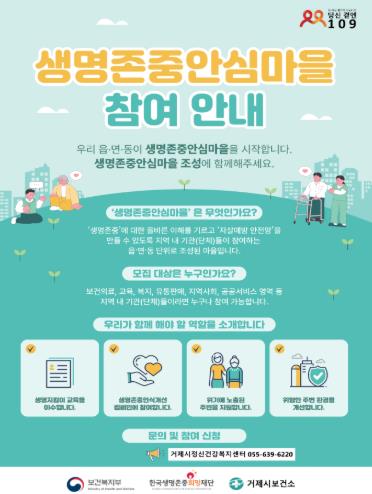올해 생명존중안심마을은 기존에 운영 중인 사등면과 장목면에 더해 아주동, 장평동, 고현동, 옥포2동을 추가 선정해 총 6개 면·동으로 확대 된다.
