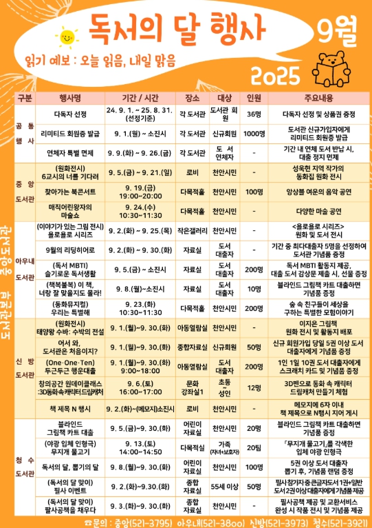 도서관 관계자는 “독서의 달을 맞아 진행되는 독서문화 프로그램에 많은 시민이 참여해 책과 한층 더 가까워지고, 독서를 통해 내일이 더 밝아지기를 바란다”고 말했다.