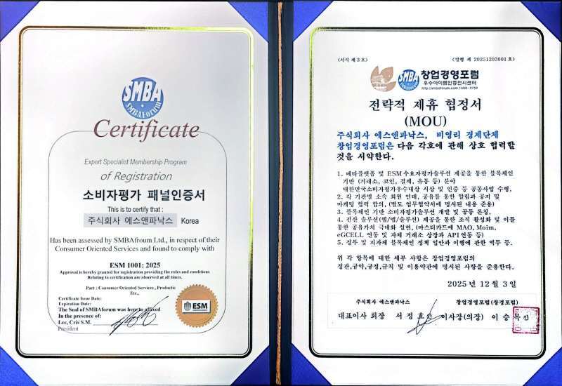 또한12월3일.(주)에스앤파낙스(서정호대표)는 대한민국 소비자평가단체창업경영포럼과 전략적제휴 및우수기업으로 인증 받으며 글로벌 시장으로 발돋움하는계기를 마련했다.