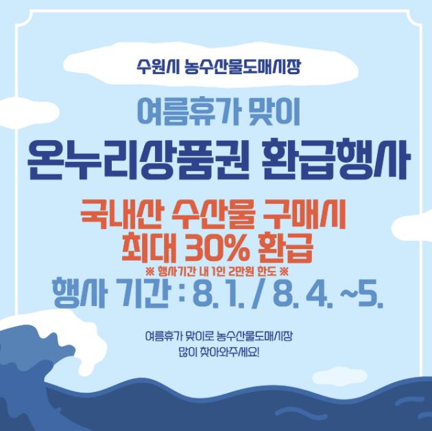 수원시 관계자는 “여름 휴가철을 맞아 국내 수산물 소비에 활력을 불어넣기 위해 온누리상품권 환급 행사를 마련했다”며 “많은 분이 수원시농수산물도매시장을 찾아 질 높은 수산물을 알뜰하게 구매하시길 바란다”고 말했다.