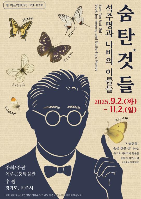 오는 9월 2일부터 11월 2일까지 여주곤충박물관에서 진행되는 '숨탄것들 : 석주명과 나비의 이름들' 특별전은 ‘2025 박물관/미술관 지원사업’에 선정되어 제작된다. ‘박물관/미술관 지원사업’은 경기도 내 170여 개소 박물관 ‧ 미술관의 차별화된 콘텐츠 및 프로그램 등 개발 ․ 운영 활성화를 위한 지원사업으로 여주곤충박물관은 이에 최종 선정되어 특별전을 기획 ‧ 운영한다.