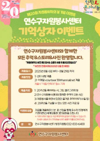 연수구자원봉사센터 권희정 센터장은 “자원봉사자 한 분 한 분이 함께 만든 20년의 역사를 돌아보는 뜻깊은 시간이 될 것”이라며“많은 자원봉사자분들의 참여를 기대한다” 고 말했다.