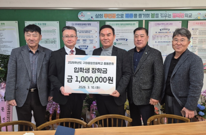 이날 전달식에는 구좌중앙초등학교 총동문회 회장을 비롯한 총동문회 관계자들이 학교를 방문해 학교생활을 시작한 1학년 입학생 5명에게 총 100만 원의 장학금을 전달하며 후배들의 힘찬 출발을 응원했다.