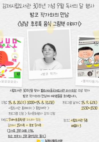 이번 작가와의 만남은 밤코 작가를 초청 “냠냠 후루룩 음식 그림책 이야기”라는 주제로 “모모모모모”, “멸치다듬기” 책을 주제도서로 그림책 속 이야기와 창작 비하인드를 직접 들을 수 있는 소중한 기회가 될 것으로 기대된다.