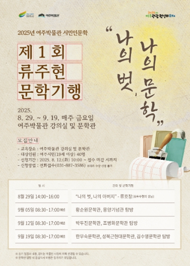 첫 일정인 8월 29일에는 류주현 선생의 장남인 류호창 건국대 명예교수가 ‘나의 벗, 나의 아버지’를 주제로 가족의 시각에서 본 류주현의 인간적인 면모와 집필 뒷이야기를 전한다. 이어 9월 5일부터 19일까지는 황순원, 박두진, 조병화, 한무숙, 김수영 문학관을 차례로 방문해, 류주현과 교류했던 동시대 문인들의 작품과 문학적 배경을 비교 탐구한다.