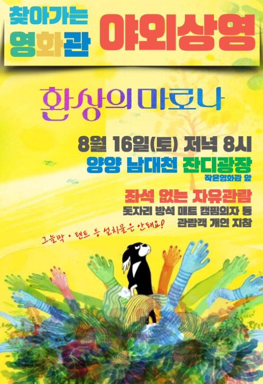 야외영화 상영작은 애니메이션 영화'환상의 마로나, '로 강아지 마로나의 일대기를 환상적인 색채와 예술적인 영상, 감동적인 이야기를 그린 애니메이션 작품으로 부천 국제애니메이션 영화제 장편 애니메이션 대상과 관객상 수상작이다.