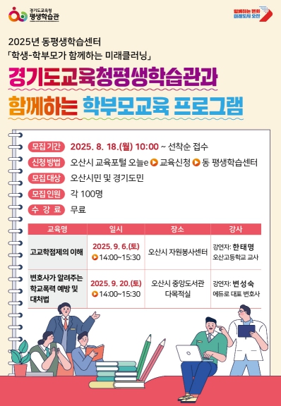 첫 강좌인 '고교학점제의 이해'는 9월 6일(토) 오후 2시 오산시 자원봉사센터에서 진행된다. 강좌에서는 새롭게 개편되는 교육정책의 핵심 내용과 학생 진로 설계 방향을 안내한다. 두 번째 강좌인 '변호사가 알려주는 학교폭력 예방 및 대처법'은 9월 20일 오후 2시 오산시 중앙도서관에서 열리며, 학교폭력의 유형과 예방 방법, 실질적인 대응 절차를 다룬다.