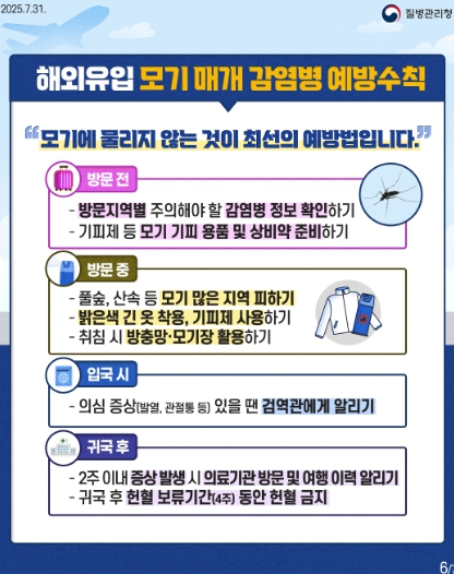 이에 해외여행을 계획하는 경우, 출국 전 질병관리청 누리집에서 여행 국가의 감염병 발생 현황과 주의 사항을 확인해야 하며, 여행 중에는 밝은색 긴 옷을 착용하고, 모기 기피제를 3~4시간 간격으로 사용하는 것이 좋다.