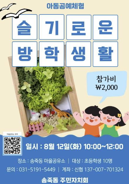 이번 행사는 다양한 계층을 대상으로 진행하는 마을공유소 활성화 프로그램 중 하나로, 여름방학을 맞은 아동들을 위한 특강 형식으로 진행된다. 강의 주제는 아이들도 쉽게 배울 수 있는 ‘공기정화 모스이끼 만들기’ 공예 체험이며, 모집인원은 초등학생 10명이다. 참여를 원하는 경우 송죽동 마을공유소로 문의하면 된다.