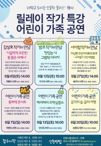 최충규 대덕구청장은 “2025 하반기 도서관 인문학 플러스 프로그램은 어린이부터 가족 단위 이용자까지 누구나 즐길 수 있도록 다채롭고 유익한 콘텐츠로 구성했다”며, “일상 속에서 인문학을 쉽고 자연스럽게 접하고, 도서관과 함께하는 독서 활동에도 도움이 되기를 바란다”고 전했다.