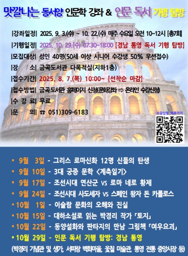 특히‘맛깔나는 동서양 인문학 이야기’강연에서는 역사, 문학, 신화 등 다양한 주제를 다루며, ‘독서 인문학 탐방 기행’은 강연 참여자를 대상으로 소설 『토지』의 작가 박경리 기념관 등이 있는 통영을 직접 방문해, 체험 중심의 독서 활동을 제공할 예정이다.
